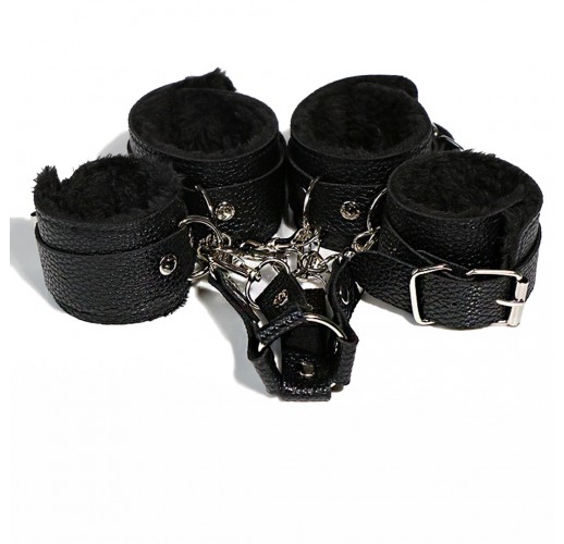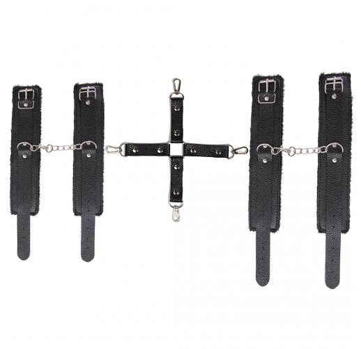 БДСМ Шкіряний фіксатор рук до ніг, що складається з наручників, шкарпеток і хрестового фіксатора.
