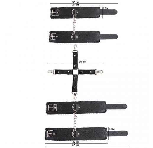 Розмір: наручники 27х5 см, ремінець + 10 см; поножі 32х5 см, ремінець + 10 см; хрестовий фіксатор 2х25 см.