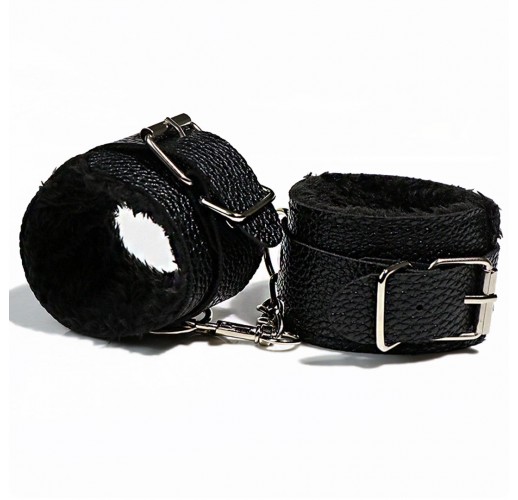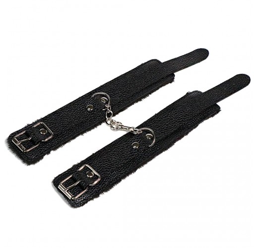 Наручники на ремінці з регульованою застібкою і зі штучним хутром з внутрішньої сторони, з'єднані ланцюжком з карабіном на одному боці.