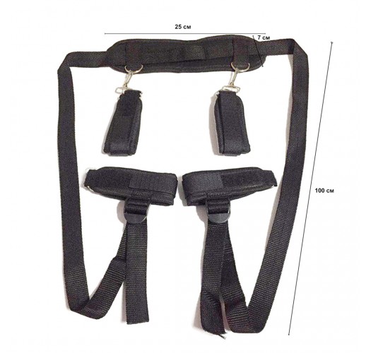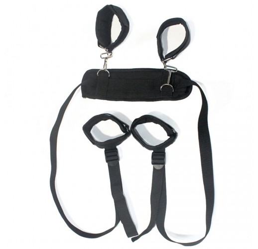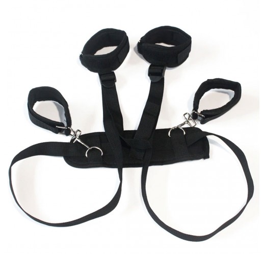 БДСМ фіксатор руки-ноги з підтримкою шиї, складається з манжетів-наручників, манжетів-пірців, ременя і з'єднувача тримача шиї.