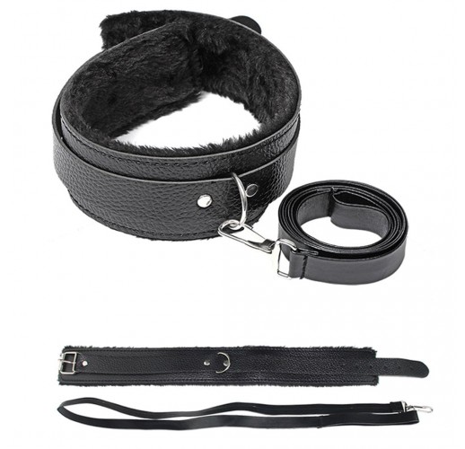 3. Шкіряний нашийник із повідцем. З внутрішньої частини нашийника штучне хутро, є півкільце для повідця і ремінець з регульованою застібкою (43х5 см., ремінець + 8 см.). Шкіряний повідець з карабіном і тримачем для руки (97х1 см.).