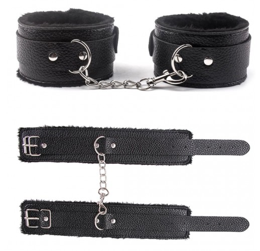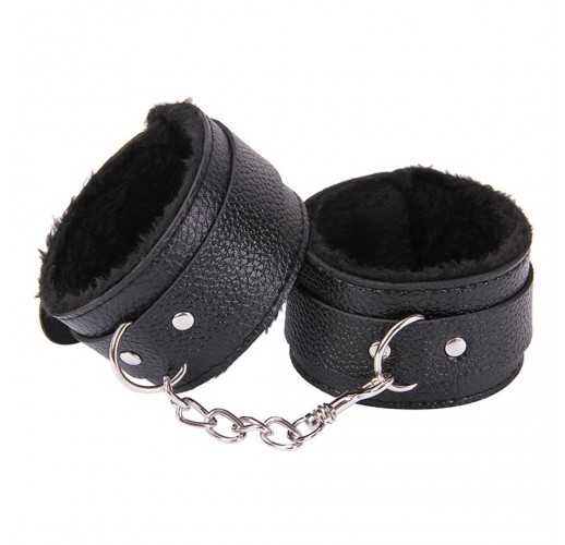 4. Шкіряні наручники, з внутрішньої частини штучне хутро, на ремінці з регульованою застібкою, з'єднані ланцюжком з карабіном на одному боці (27х5 см, ремінець + 10 см).