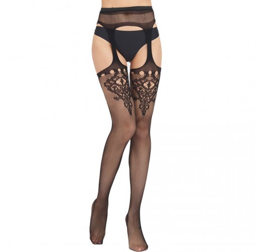 Еротичні колготки з імітацією панчіх з поясом-гумкою та чотирма підтяжками в середню сітку, зверху панчіх прикрашений орнаментом, ззаду смужка імітація шва та орнамент вище п'яти, відкриті стегна, ущільнений мисок.