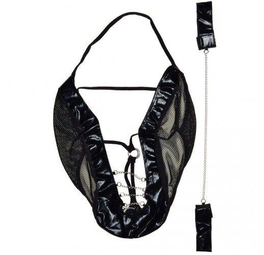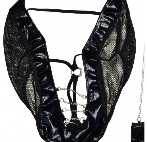 Еротичний Боді - Монокіні з двох смужок через шию в дрібну сіточку зі вставками з еластичного блискучого матеріалу (під латекс), що переходять у труси і нижче талії, з'єднаними п'ятьма металевими ланцюжками, ззаду труси-стрінги гумки з'єднані металевим кільцем.