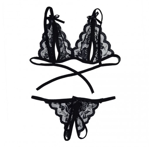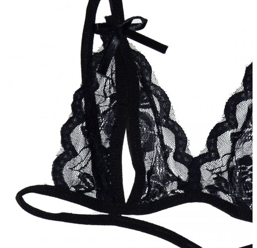 Бюстгальтер з трикутними чашечками з розрізами по центру, прикрашений маленькими бантиками, зав'язується ззаду.