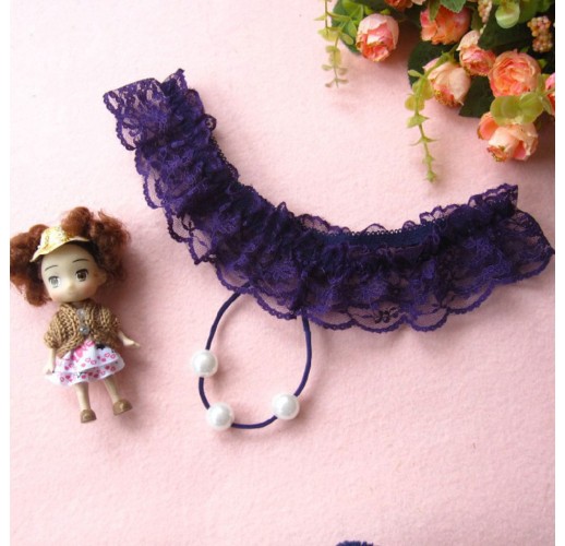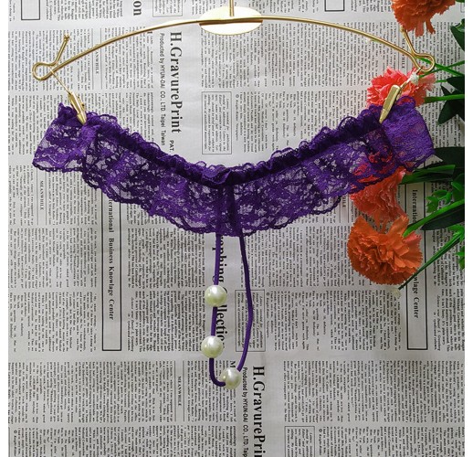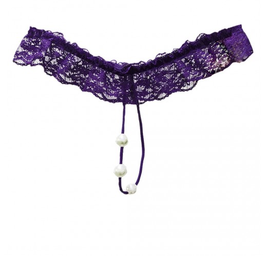 Фіолетові еротичні труси стрінги, пояс із драпірованого контрастного мережива, по центру три перлини.