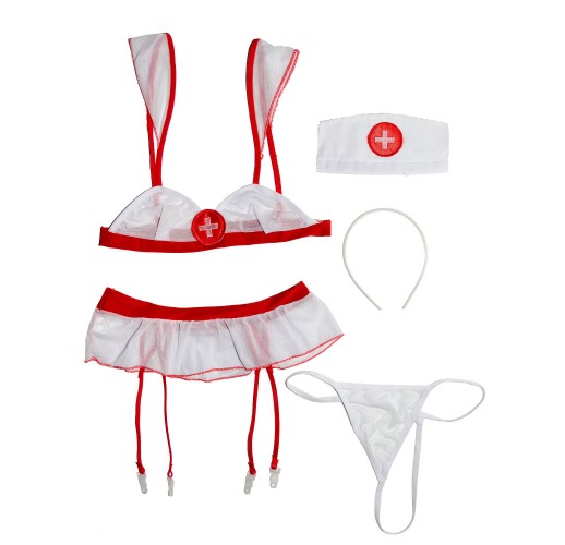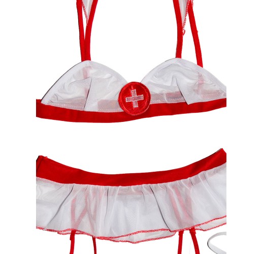 Еротичний ігровий костюм "Медсестра" (костюм для рольових ігор): бюстгальтер, мікро-спідниця з підв'язками (без панчіх), труси, ободок на голову. Стетоскоп не входить до набору.