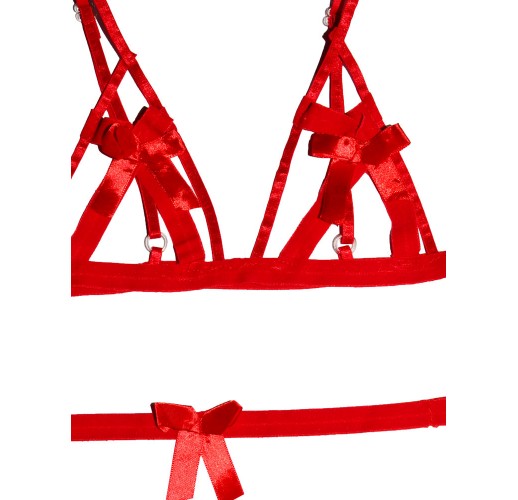 Бюстгальтер з відкритими чашечками з пересічними атласними стрічками і бантиком по центру, регульовані бретельки, під грудьми широка гумка.