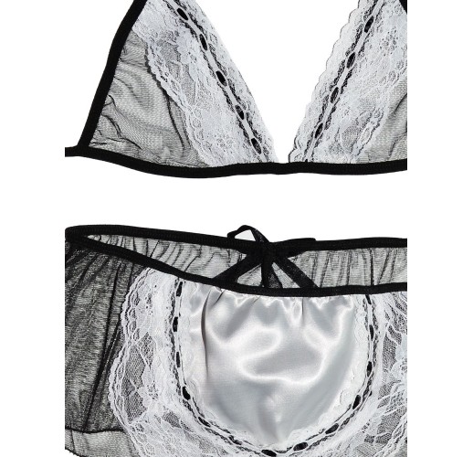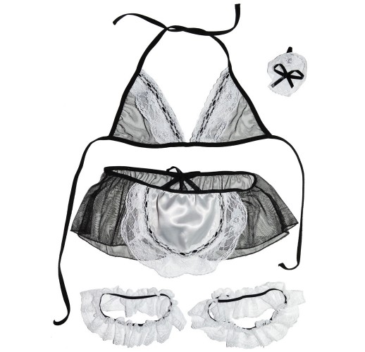 Прозорий еротичний ігровий костюм "Покоївка" (костюм для рольових ігор): бюстгальтер, спідниця-фартук-труси, підв'язки і шпилька.