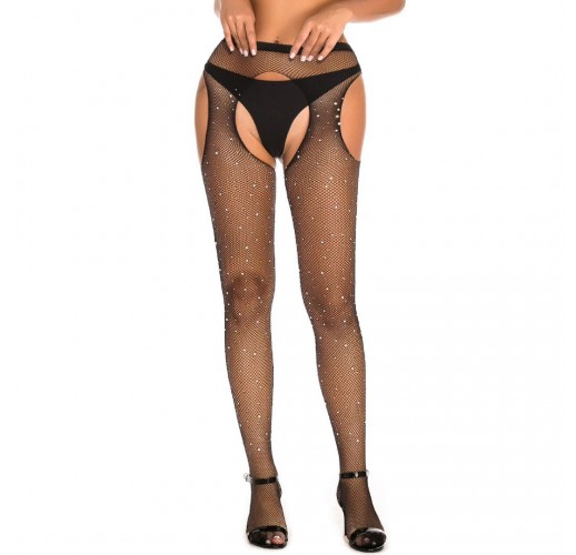Еротичні колготки в дрібну сіточку з приклеєними стразами та вирізами в ділянці стегон (імітація поясом із чотирма підтяжками та панчохами).