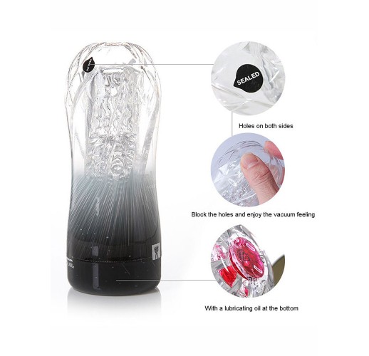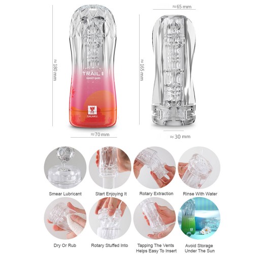 Багаторазовий нереалістичний чоловічий мастурбатор Galaku TRAIL II з мінливим рельєфом Sunset Qasis всередині з еластичного матеріалу еластомеру в пластиковому корпусі-чашці з отворами з боків для створення вакууму.