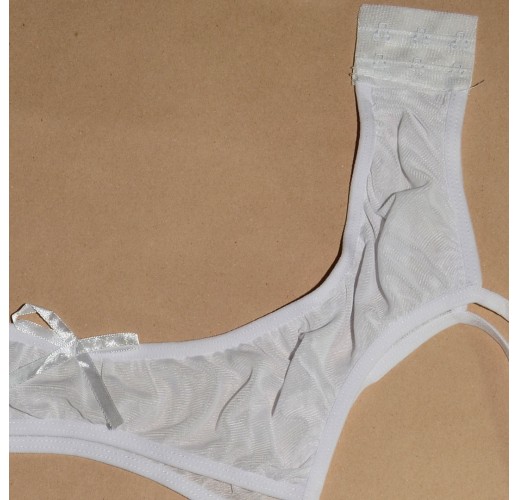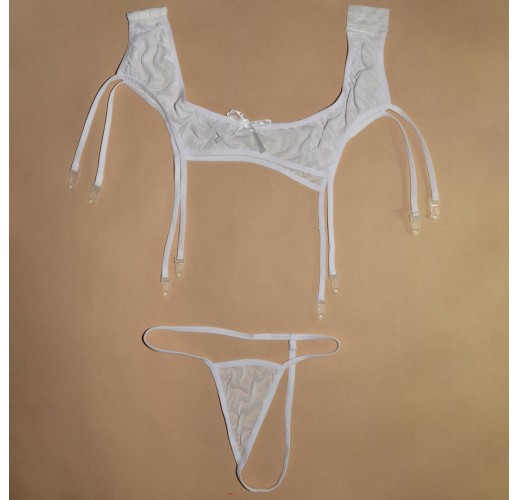 Двошаровий напівпрозорий пояс для панчіх (без панчіх), по центру прикрашений маленьким бантиком, застібається ззаду на три гачки (два варіанти), вісім підв'язок.