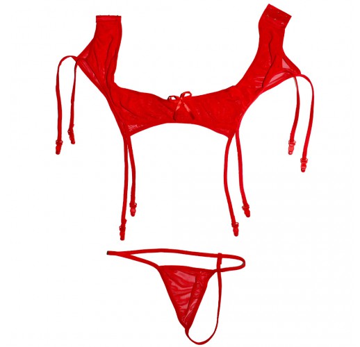 Двошаровий напівпрозорий пояс для панчіх (без панчіх), по центру прикрашений маленьким бантиком, застібається ззаду на три гачки (два варіанти), вісім підв'язок.