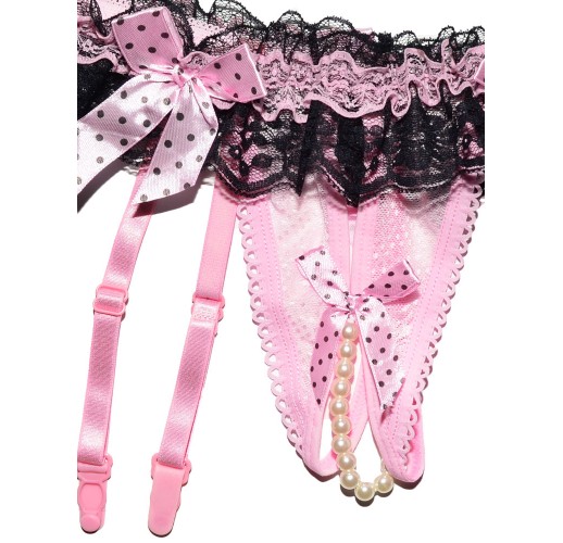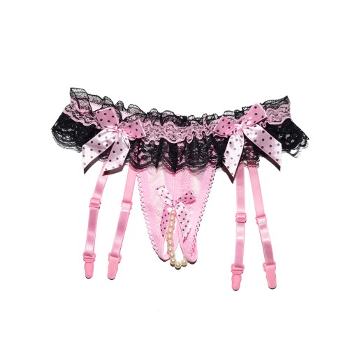 Пояс-труси для панчіх (без панчіх) з прозорого мережива, в поясі драпірована двоколірна мереживна воланиста оборка, труси-стрінги з ажурним оздобленням по краю та розрізами, по центру ластавниці намистинки на гумці, пояс прикрашений бантиками в горошок (спереду на поясі два, спереду на трусах один, позаду по центру один), чотири підв'язки, що регулюються.