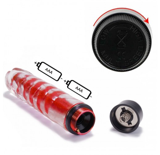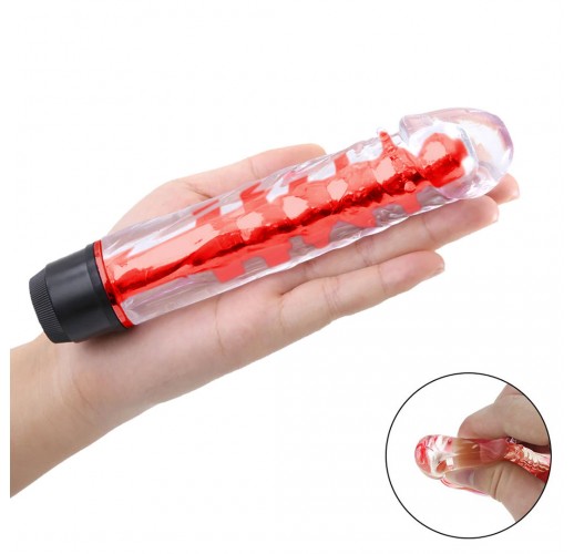 Гелевий вібратор анатомічної форми з регульованою інтенсивністю для вагінальної мастурбації, з'ємна гелева налагодка з пухирцями під голівкою (зручно мити, добре тягнеться - можна використовувати як насадку на інші іграшки), нижня частина ручки поворотна, блискучий внутрішній пластиковий стрижень із випуклостями по всій довжині (можливо використовувати для більш потужної зовнішньої стимуляції: сосків, клітора, мошонки).